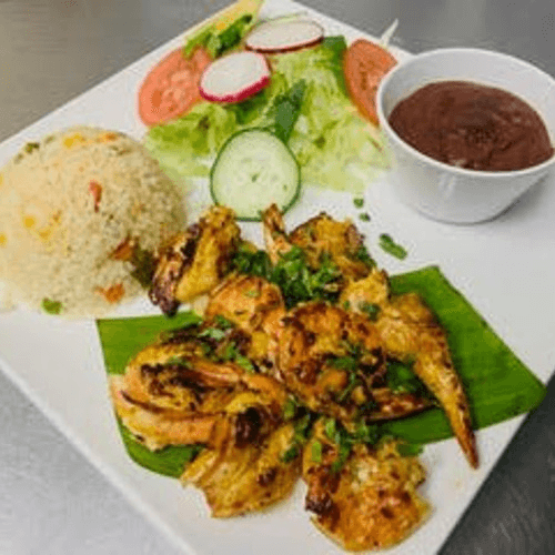 Ranch-style semi-spicy shrimp. Served with beans, rice, salad, and tortillas.