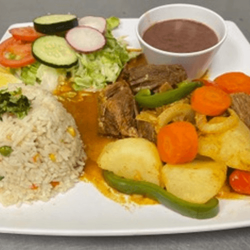 Beef stew. Served with beans, rice, salad, and tortillas.