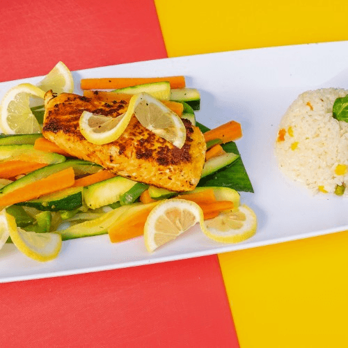 Salmon with rice and vegetables. Does not include beans, tortilla, or salad.