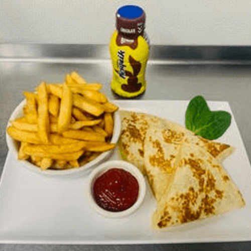 Served with fries and apple juice.