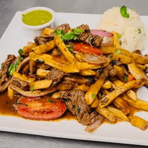 Stir-fried beef with French fries. Does not include beans, tortilla, or salad.