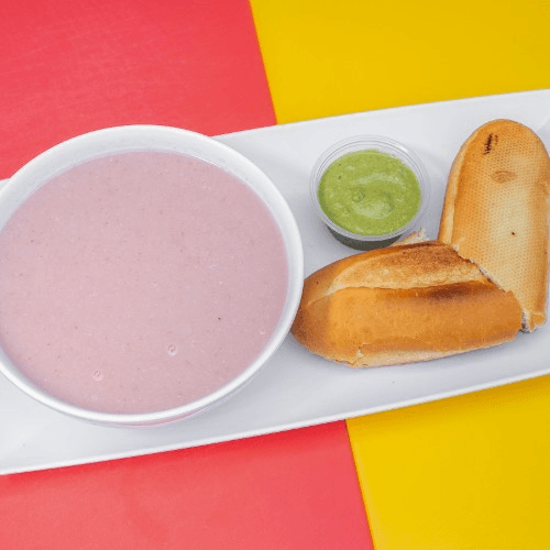Beet soup with mixed vegetables accompanied with a side of rice, lemon, onions and cilantro to top it off.