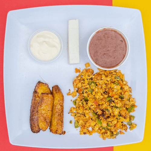 Scrambled eggs with tomato, onions, and green bell peppers. Served with beans, fried plantains, sour cream, fresh cheese, and tortillas.