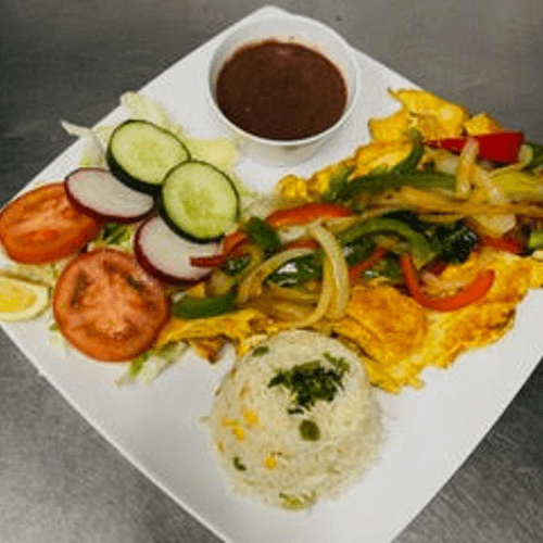Scrambled eggs with loroco, tomato, onions, and green bell peppers. Served with beans, fried plantains, sour cream, fresh cheese, and tortillas.