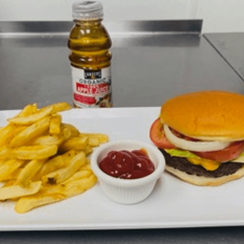 Served with fries and apple juice. Substitute juice for milk for an extra charge.